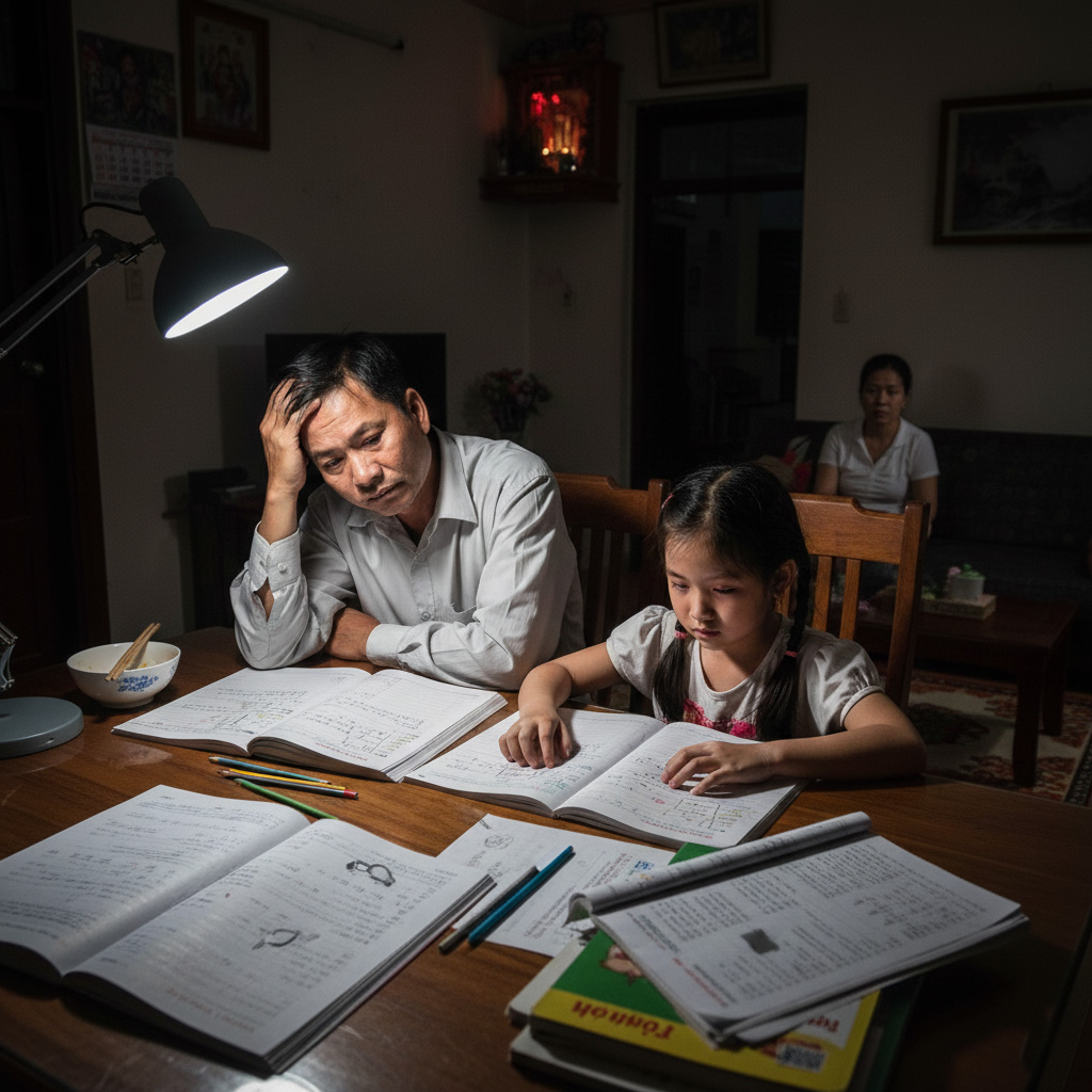 Không khí trong nhà bỗng chốc nặng nề, tiếng thở dài thay cho tiếng cười. Khoảnh khắc ấy, mình chợt nhận ra, hình như mình đang vì áp lực bài vở mà đánh mất đi những giây phút quý giá bên con. Đáng lẽ buổi tối phải là lúc cả nhà quây quần, chia sẻ chuyện vui buồn, thì giờ đây lại biến thành một "ca học thêm" đầy căng thẳng. Nhìn con vừa học vừa sợ sệt, lòng mình lại quặn thắt.
