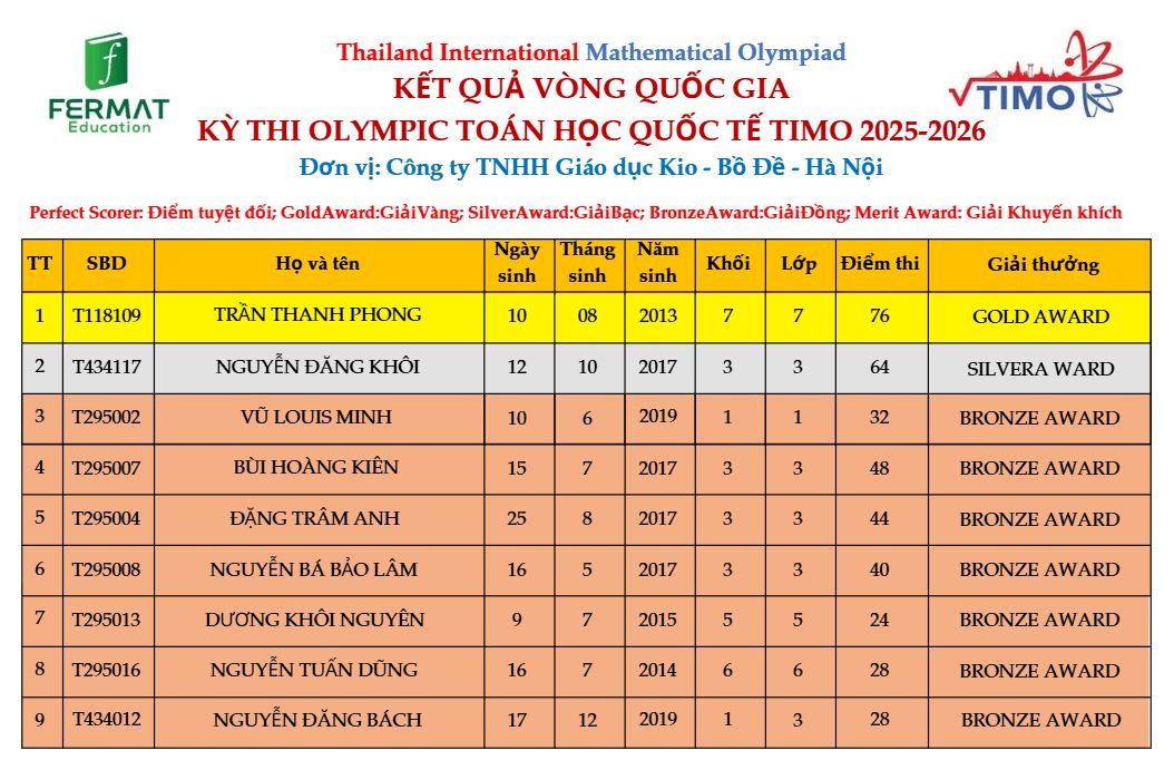CHÚC MỪNG NHỮNG "NHÀ TOÁN HỌC NHÍ" KIOMATH TẠI KỲ THI QUỐC GIA TIMO 2025-2026!