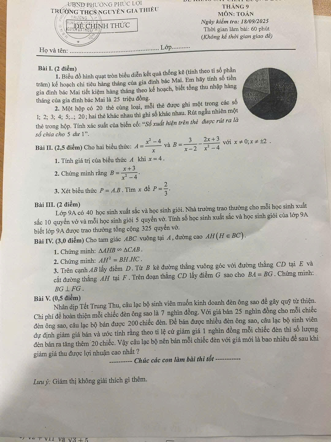 Đề khảo sát chất lượng giữa học kì I môn Toán 9 THCS