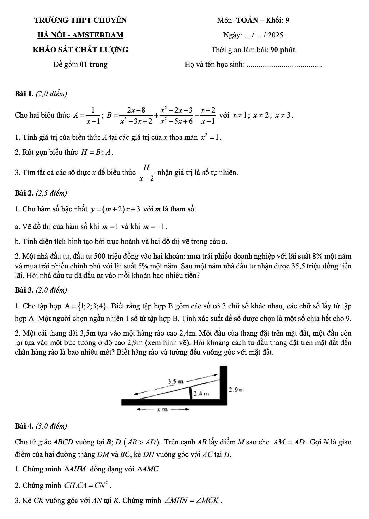 Đề khảo sát chất lượng đầu năm trường THPT Chuyên Hà Nội - Amsterdam: